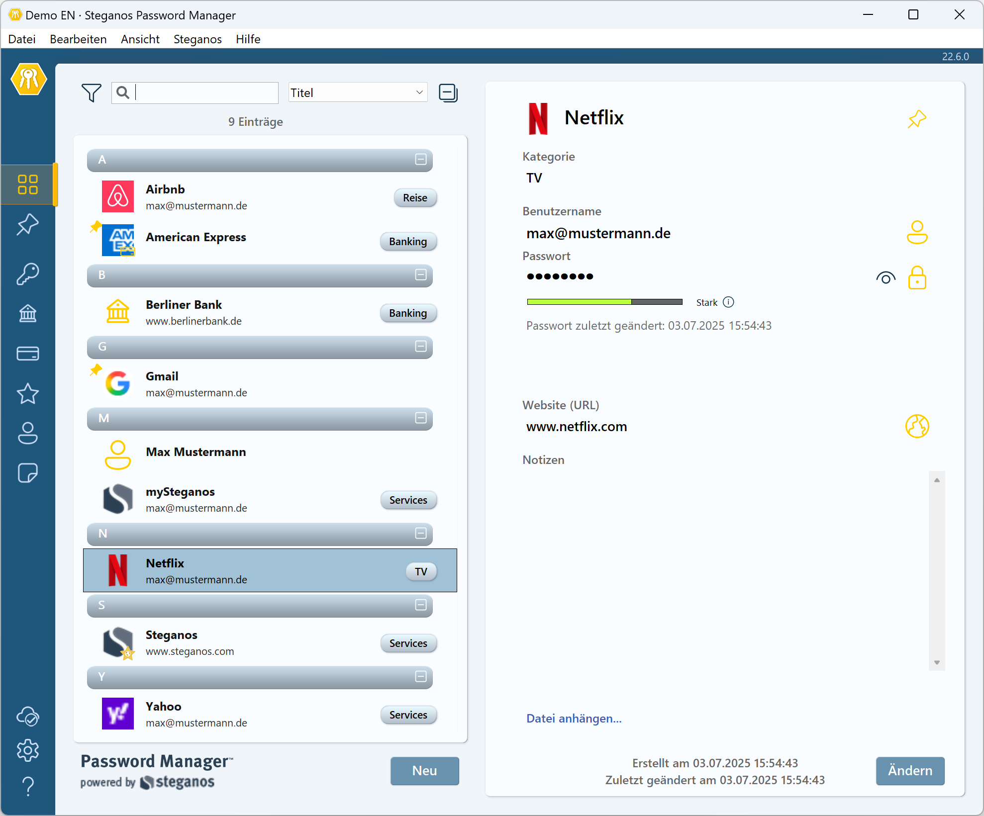 Die Passwort-Qualitäts-Leiste und die Entropieanzeige werden während der Eingabe aktualisiert und helfen Ihnen, mühelos sichere Kennwörter zu erstellen, die den Anforderungen der Branche entsprechen.Vereinfachte Kategorisierung von Einträgen