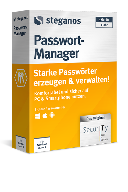 Eine große Hilfe, um diesen Problemen aus dem Weg zu gehen, sind sogenannte Passwort-Manager, wie z.B. der Steganos Passwort Manager. Mit diesen können Sie eine sichere Datenbank Ihrer Passwörter erstellen, die durch ein einzelnes, starkes Passwort, das Sie sich merken, abgesichert sind.